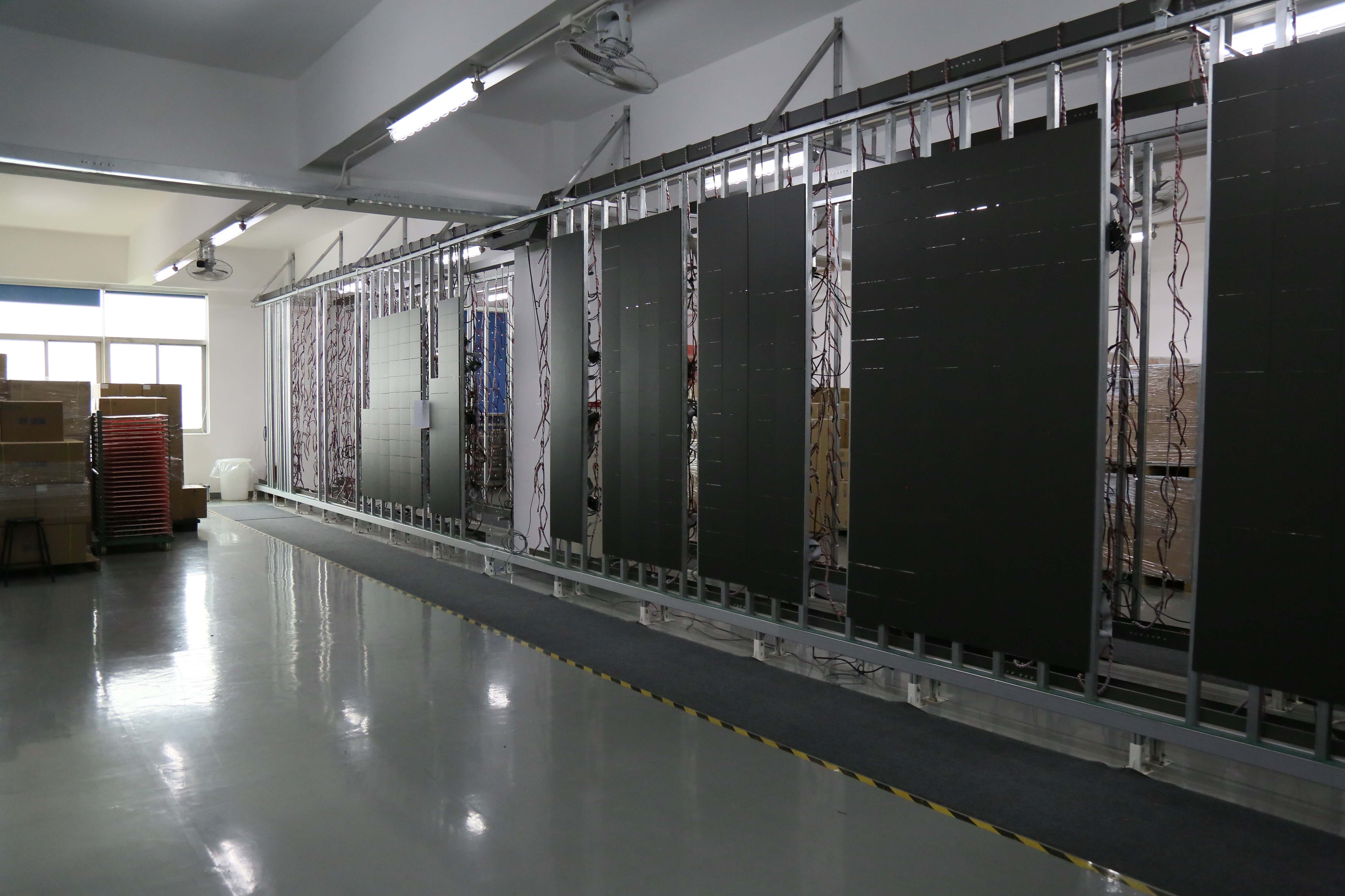 在二楼看完SMT生产车间,向总带领大家来到四楼的展厅,展厅里有用LED柔性屏包成的圆柱屏,有P1.25的室内小间距做的会议一体机、有P3的LED地砖屏、还有用COB 倒装工艺做的P0.9的超小间距屏,整个展厅每块屏结合应用场景,他的尺寸大小和分辨率恰到好处;让参观者既能看到LED显示屏显现的实际效果,又能做到炫酷伤眼。展厅里排满了定制的LED显示屏箱体,也摆有像素点不一样密度的模组。福兴光电刘工向客人介绍箱体硬链接指的是室内小间距显示屏正反两面都是铝型材,电源线、信号线都是做好的子母接头扣,正面箱体和背面箱体对扣就接好了链线,正面和背面看上去都是一个封闭的整体,通电,通信号就可以试用LED显示屏啦。箱体软链接指的是。室内小间距LED显示屏正面是箱体,背面的电源线、排线都需要一对一的单组链接,背面会看到有线。