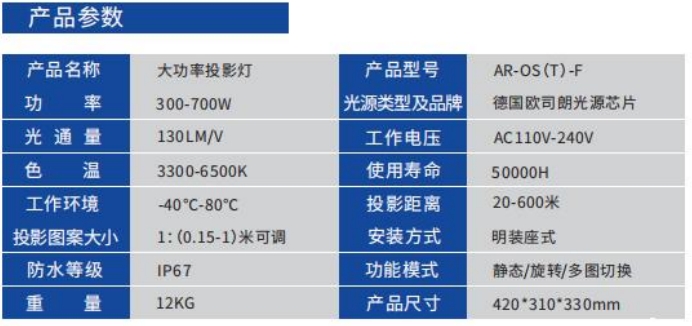 大功率投影灯是一种专业的光源设备,主要用于大型户外广告,远距离亮化工程,具有投影距离远,图案覆盖面积大,高亮清晰等特点。该产品采用大功率LED灯源,可以提供明亮而清晰的投影效果,即使在白天环境中,仍然可以保证投影内容的可见形,确保投影信息的有效性。