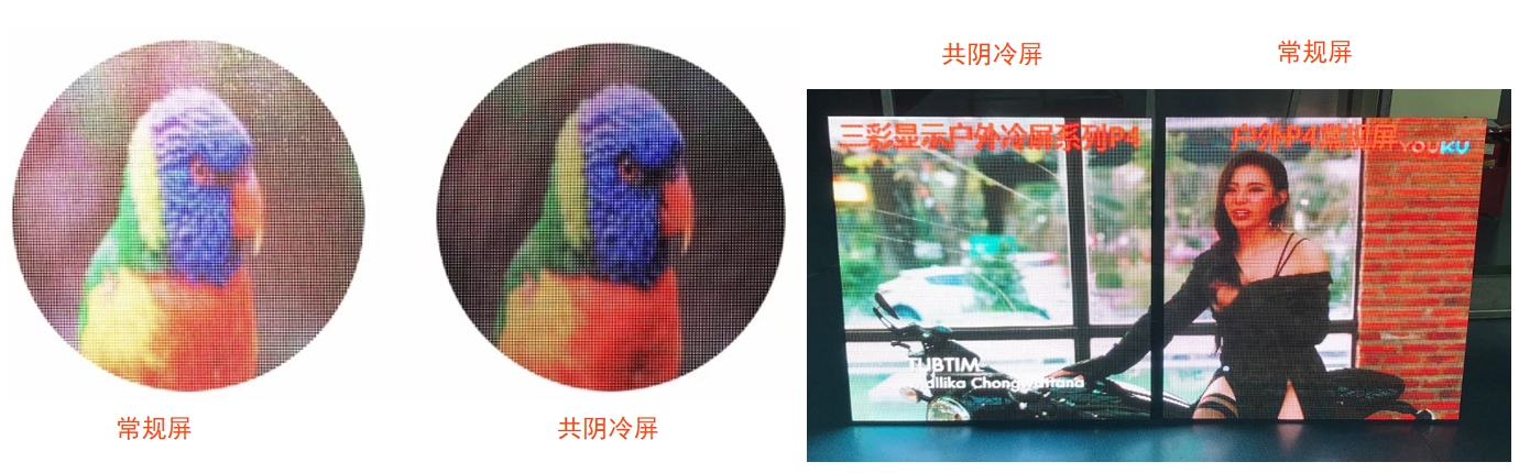 “共阴”是指共阴极供电方式,“阴”即负极,与阳极(正极)相反,是指使用阴极为LED显示屏供电。共阴冷屏采用共阴灯珠,采用将LED灯珠的R, G, B(红、绿、蓝)电源分开供电,精准地分别为R,G, B灯珠分配电流电压,因为R、G、B(红、绿、蓝)灯珠所需要的最佳工作电压和电流是不相同的,,所以电流会先经过灯珠,然后到达IC的负极,降低正向压降,减小传导内阻。